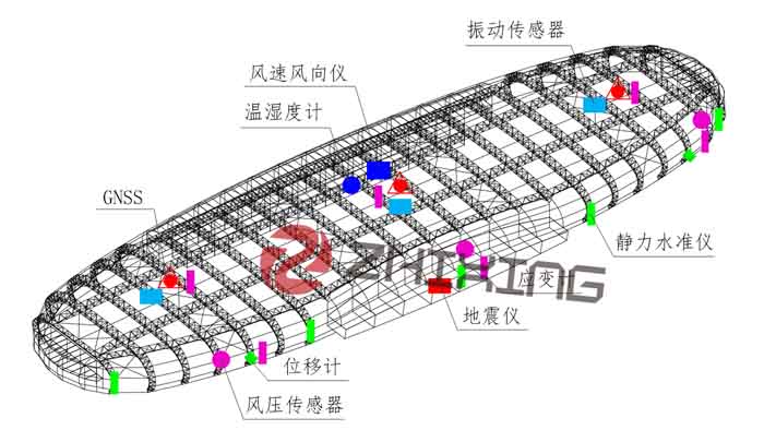 大跨空間結(jié)構(gòu)主要監(jiān)測內(nèi)容:風(fēng)速風(fēng)向、風(fēng)壓、環(huán)境溫濕度、水平豎向變形、基礎(chǔ)沉降、支座位移、地震、結(jié)構(gòu)振動、結(jié)構(gòu)應(yīng)變